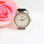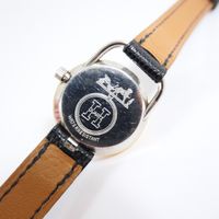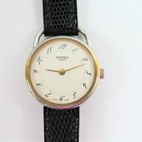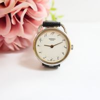HERMES Paris. Montre bracelet «Arceau» (PM) : Boitier rond (25mm) en acier et métal doré, cadran blanc, chiffres arabes peints en éventail. Mouvement à quartz. Bracelet en cuir noir Hermès, boucle ardillon en métal,doré non signée. Numérotée. Tour de poignet entre 15 et 17 cm environ. Sans écrin, ni papiers. (Rayures, usures au niveau du métal doré, salissures).