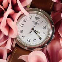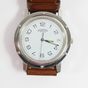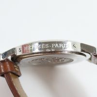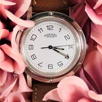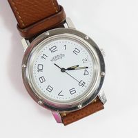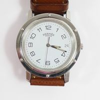 HERMES Paris. Montre-bracelet «Clipper» : en acier. Boîtier rond (36mm environ). Cadran blanc, chiffres arabes, guichet dateur à 3h. Mouvement quartz. Fond clippé. Bracelet en cuir marron Hermès. Boucle ardillon en acier signée. Sans écrin, ni papiers. Rayures d'usage, quelques salissures. La collection Clipper voit le jour en 1981 et devient rapidement une collection phare de la maison Hermès. La lunette en forme de hublot évoque les voiliers du XIXème siècle.