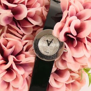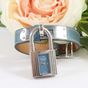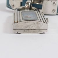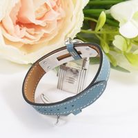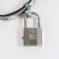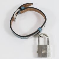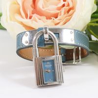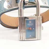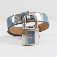 HERMES Paris. Montre bracelet "Kelly": Boitier (20mm environ) de forme cadenas en métal argenté palladié cannelé. Cadran bleu à index, mouvement à quartz. Signée et numérotée. Ref.KE1.210. Bracelet en cuir bleu Hermès surpiqué blanc, boucle ardillon en acier signée. Tour de poignet 14,5 à 17cm environ. Rayures, salissures, manque 1 vis. Cadran légèrement oxydé. Mouvement rouillé non fonctionnant. A réparer. Sans écrin, ni papiers.