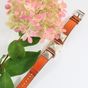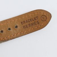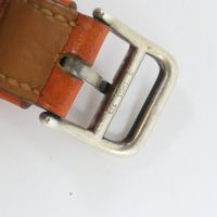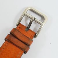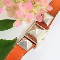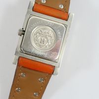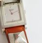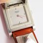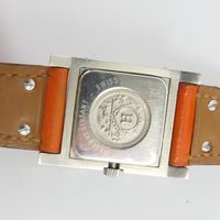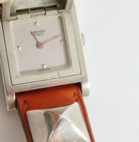 HERMES Paris. Montre bracelet « Médor » : motifs clous en argent 925mil. dont un ouvrant, dissimulant le cadran. Boitier en argent 925mil. (30 x 23mm environ). Cadran argenté à index. Mouvement quartz. Numéroté. Bracelet en cuir orange Hermès (taches, usures), boucle ardillon en argent 925mil. non signée. Tour de poignet : 14-16,5 cm environ. Rayures. Sans écrin, ni papiers. 49,7g brut.