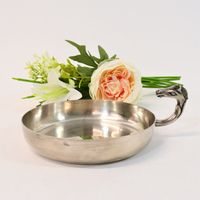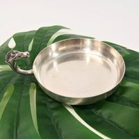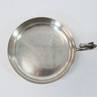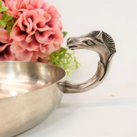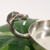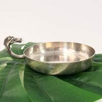 HERMES Paris par RAVINET d'ENFERT : Coupelle vide poche circulaire en métal argenté, prise latérale en forme de tête de cheval. Signée Hermès, poinçon Ravinet d'Enfert. Diamètre : 14 cm. Rayures.