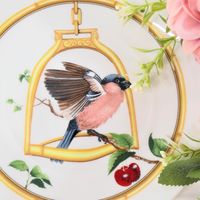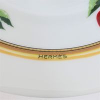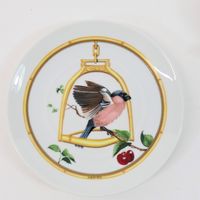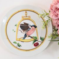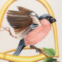 Hermès. Petite assiette ou coupelle " L’étrier perchoir" : en porcelaine de Limoges modèle, représentant un Bouvreuil pivoine sur un étrier traversé d'une branche de cerisier. Marque et signature au revers. Diam:16,5cm. Très bon état.