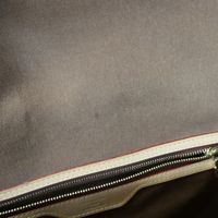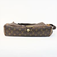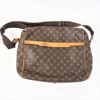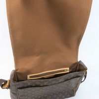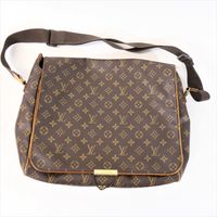 LOUIS VUITTON année 2017. Sacoche « Abbesses » 36cm : en toile Monogram et cuir naturel, fermeture élastique sur crochet sur rabat, poche plaquée au dos et sangle horizontale à l’arrière permettant de le passer dans la poignée télescopique d’une valise. Anse bandoulière sangle réglable marron en tissu. Deux poches plaquées sur le devant, une poche zippée et deux plaquées à l'intérieur. Numérotée. Ht 30 x Larg 36 x Prof 10cm. Usures, patine, quelques petites taches intérieur. Dustbag.