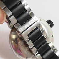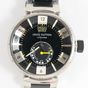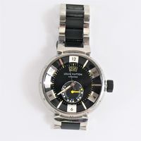 LOUIS VUITTON. Bracelet-montre "Tambour In Black Power Reserve" Ref. Q109G : Boitier rond en acier, cadran noir et acier (44mm), aiguilles luminescentes, guichet dateur à 12H, réserve de marche à 6h. Mouvement mécanique à remontage automatique. Numérotée. Bracelet en maillons articulés acier et caoutchouc noir, boucle déployante acier signée. Sans écrin, ni papiers. Son cadran inspiré d'un tableau de bord permet de visualiser d'un coup d'œil la réserve de marche restante.