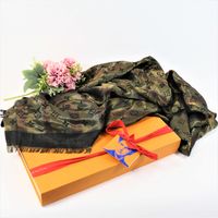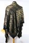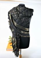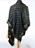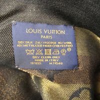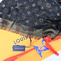 LOUIS VUITTON. Châle Monogram So Shine : en soie, laine et fils métallisés noir, doré et cuivre. Bordure frangée. Etiquette. 140 x140cm environ. Composition : soie (50%), viscose (24%), laine (16%) et fils métallisés (10%). Boîte, ticket de caisse. Bon état général. Confectionné dans un mélange de soie et de fils métallisés, ce châle Monogram So Shine se pare d'une allure brillante subtile. Ce modèle étincelant est orné du motif Monogram et de la signature Louis Vuitton tissée, tous deux emblématiques de la Maison. Cette pièce somptueuse peut être portée en toute occasion.