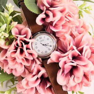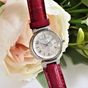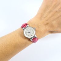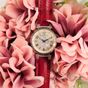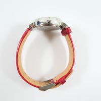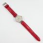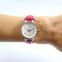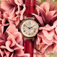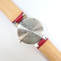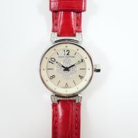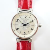 LOUIS VUITTON. Montre bracelet de dame «Tambour» Réf. Q121P : Boitier rond 28mm environ en acier. Cadran en nacre à décor central d'une "Fleur de Monogram" diamantée, chiffres arabes en applique. Mouvement à quartz. Gravée Louis Vuitton sur la tranche du boîtier. Les attaches autour du boitier pavées de diamants. Bracelet en crocodile rouge Louis Vuitton. Boucle ardillon en acier signée LOUIS VUITTON. Très bon état. Sans écrin, ni papiers. Version féminine et glamour de la Collection Tambour. Raffinement avec le cadran en nacre, let la Fleur de Monogram diamantée.