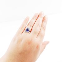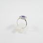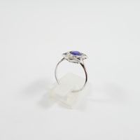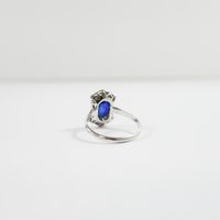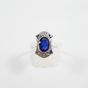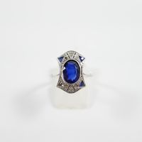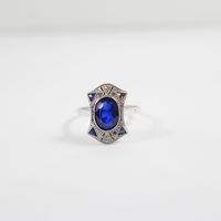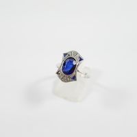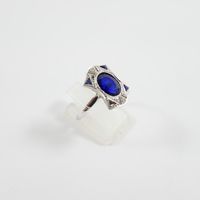 Bague géométrique en or gris 750 mil. centrée d'une pierre bleue imitation rehaussée de pierres bleues taille triangle et de roses. (TDD : 57). (Manque 1 rose et 1 pierre bleue, égrisures). (Anneau rapporté). 3,1 g. brut