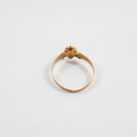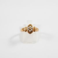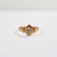 Bague vers 1900, en or 750 mil. à chaton navette à décor d'une fleurette sertie de semences de perles. Travail français. (TDD : 57). 1,6 g brut