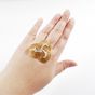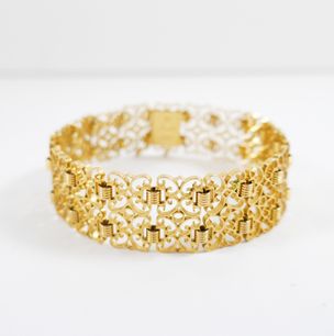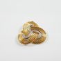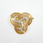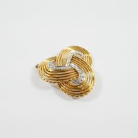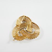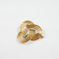 Broche triple spirales entrecroisées, années 40-50, en or 750 mil. et platine 950 mil. à décor ajouré de fils d'or, rehaussée de diamants brillantés. Travail français. (Dimensions : 3,7 x 4 cm environ). 11,8 g.
