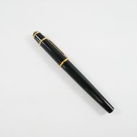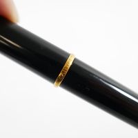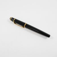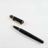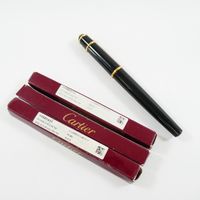 CARTIER : Stylo roller "Diabolo" en résine noire et métal doré. Signé et numéroté. (Micros rayures). On y joint 3 recharges dans leur emballage.