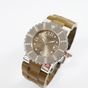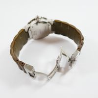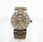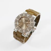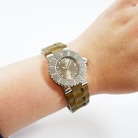 CHAUMET, Class One : Montre de dame en acier, boîtier rond (diamètre : 33 mm), lunette tournante unidirectionnelle sertie de diamants taille brillant, cadran rayonnant kaki, chiffres romains et index points luminescents, guichet dateur à 6 H, mouvement à quartz, sur bracelet en caoutchouc kaki à boucle déployante papillon en acier signée. Signée et numérotée. (longueur : 15 cm) (verre rayé, usures et craquelures au bracelet).