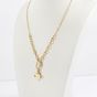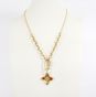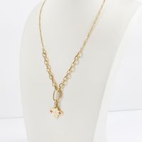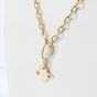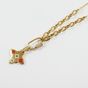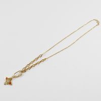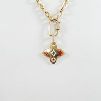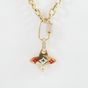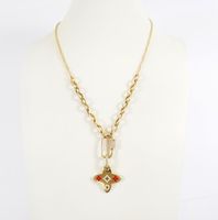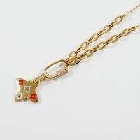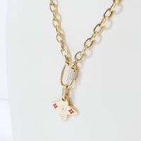 Collier en or 750 mil. à maille forçat terminé par un motif trèfle et mousqueton à décor émaillé rouge, blanc et noir, rehaussé de pierres blanches imitations. (Longueur : 43,5 cm environ). (Pierres manquantes). 9,4 g. brut [Exempté : art. 524 bis du CGI al. c]