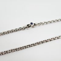 Collier en or gris 750 mil. à maille carrée. Le fermoir mousqueton rehaussé d'un cabochon de pierre bleue. (Longueur : 44 cm). 17 g. brut