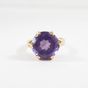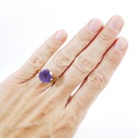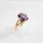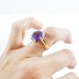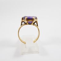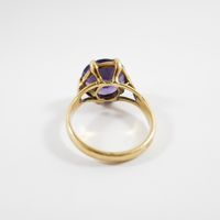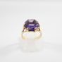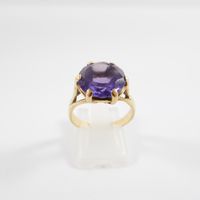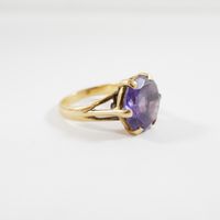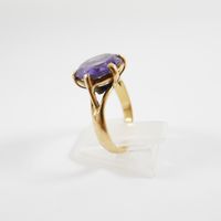 Bague : en or 750 mil. ornée d'une pierre de synthèse bleu-violette (TDD : 55,5) (dimensions pierre : 11,8 x 6,5 mm environ) (usures aux griffes). 5,5 g. brut