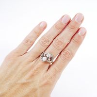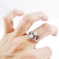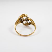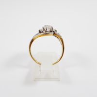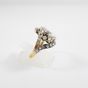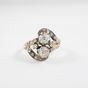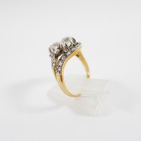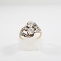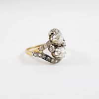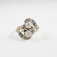 Bague "Toi et Moi" : en deux ors 750 mil. ornée de 2 diamants taille ancienne de 0,45 carat environ chacun entre deux diamants taille brillant, le tout épaulé de diamants tailles 8/8 et rose (TDD : 58) (largeur : 17,2 mm environ) (trace de mise à taille, petits éclats, soudures, restaurations). 5,4 g. brut