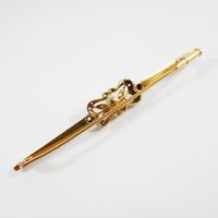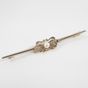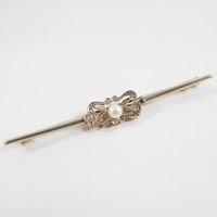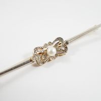 Broche barrette : en deux ors 750 mil. et platine 850 mil. sertie d'une perle de culture et de diamants taille rose (longueur : 7 cm environ) (largeur : 9 mm environ) (déformation importante, éclats). 4,3 g. brut
