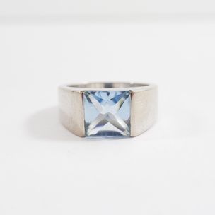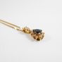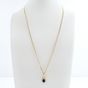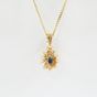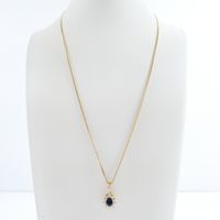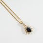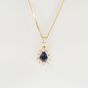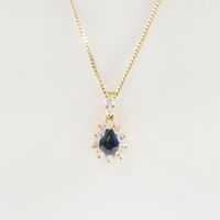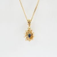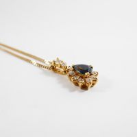 Chaîne et pendentif : en or 750 mil., chaîne à maille gourmette (longueur : 51 cm environ) (3,8 g.) et pendentif serti d'un saphir taille poire de 0,90 carat environ dans un entourage de pierres imitation (hauteur : 2 cm environ) (2,9 g. brut). Travail français. 6,7 g. brut