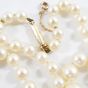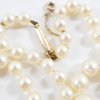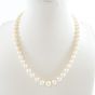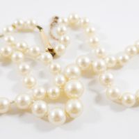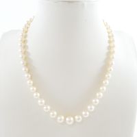 Collier de perles de culture : d'un rang en chute, fermoir et chaînette de sécurité en or 750 mil. (longueur : 37 cm environ) (diamètres perles : de 5,6 à 8,1 mm environ). 17 g. brut