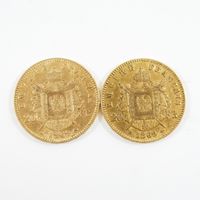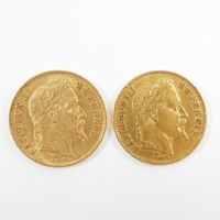Deux pièces de monnaie : de 20 FRF en or 900 mil. (1969) (usures). 12,9 g.