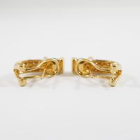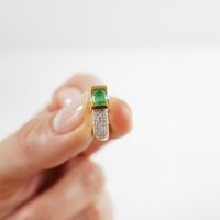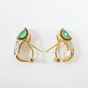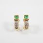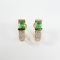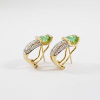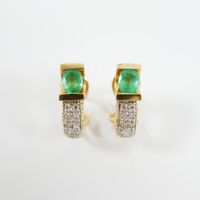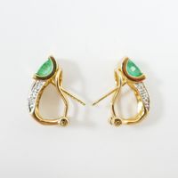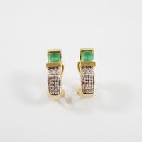 Paire de boutons clips d'oreilles : en deux ors 750 mil. ornés chacun d'une émeraude ovale et de diamants taille brillant (hauteur : 16 mm environ) (très légères égrisures). 4,7 g. brut