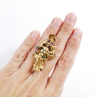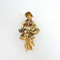 Travail italien des années 1950-1960, Broche : en or 750 mil. représentant une jeune élégante au panier sertie de pierres imitation et réhaussée d'émail (hauteur : 4,7 cm environ) (émail accidenté). 12,4 g. brut