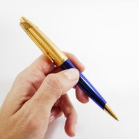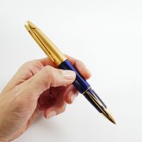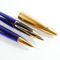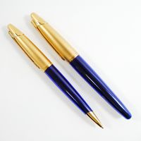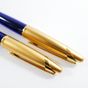 WATERMAN "Edson", Parure de stylos : en métal doré et résine bleue, composée d'un stylo-plume et d'un stylo à bille, plume en or 750 mil., signés et numérotés (longueur : 15 cm environ). Poids plume : 43,1 g. brut [Exempté : art. 524 bis du CGI al. c]