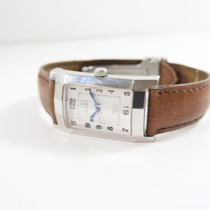 150 / 200 €DUNHILL, FACET : montre bracelet d'homme en acier, boîtier rectangulaire, lunette et verre convexe à pans coupés, cadran blanc à chiffres arabes pour les heures, chemin de fer pour les minutes, guichet dateur à 6H. Mouvement quartz, sur bracelet en cuir usagé à boucle déployante siglée. Signée et numérotée. (Dimensions : 40 x 22,5mm). Petites rayures d'usage.