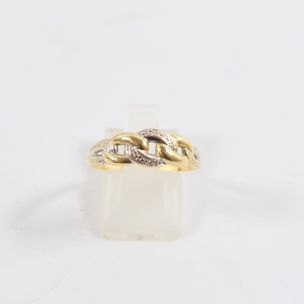 80 / 120 €Bague nœud ajouré 2 ors 750 mil., ornée de petits diamants taille 8/8. (TDD : 57). Poids brut : 1,7g.