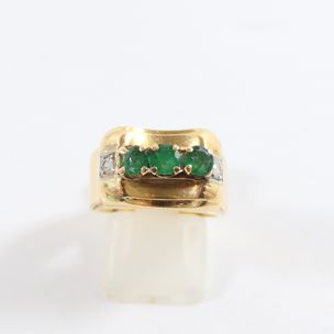 450 / 500 €Bague chevalière : en or jaune 750 mil. centrée de trois petites emeraudes et épaulées de deux diamants taille brillant (0,04 carats environ). (TDD : 52). Poids brut : 8g.