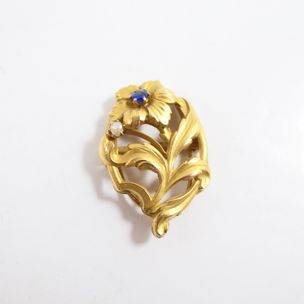 120 / 150 €Coulant de foulard ovale : en or jaune 750 mil. à décor floral ajouré orné d'une petite perle baroque et d'une pierre bleue. (Dimensions : 2,5 x 2 cm). Poids brut : 2,3g. Travail français.