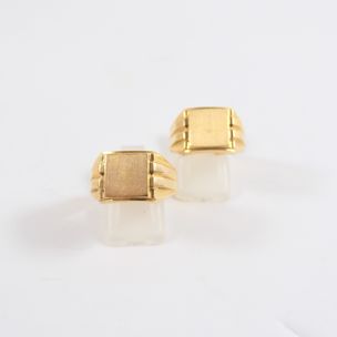 360 / 400 €Lot de 2 chevalières : en or jaune 750 mil. à section carrée à décor godronné. (TDD : 59 -63). Petites rayures. Poids : 6,6g.