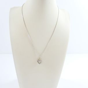 180 / 220 €Pendentif cœur ajouré : en or gris 750 mil serti de petits diamants taille brillant (0,02 carats environ) sur chaîne à maille forçat en or gris 750 mil. (Longueur : 41 cm environ). Poids brut total : 3,4g