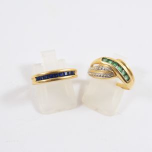 300 / 350 €Lot de 2 bagues : en or jaune 750 mil comprenant une bague croisée sertie de petites émeraudes. Et une seconde bague sertie d'une ligne de saphirs calibrés. (TDD : 49 - 53,5). Poids brut total : 5,5g