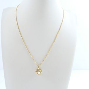 200 / 250 €Pendentif cœur ajouré : 2 ors 750 mil. centré d'une perle sur chaîne à maille gourmette. (Longueur : 40cm). Poids brut : 3,6g