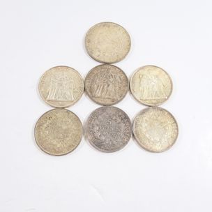 70 / 80 €Lot de 7 pièces de monnaies : en argent 800 mil. Dont 5 pièces de 10 francs Hercule, 1 pièce de 5 francs Hercule, 1 pièce de 50 francs Hercule. Poids total : 180g