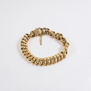 1 000 / 1 050 €Bracelet à maille gourmette russe : en or jaune 750 mil. fermoir cliquet, huit de sécurité et chaînette de sécurité. (Tour de poignet : 16,5cm environ) Poids : 19g. (Mailles tordues)