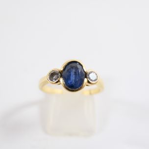 200 / 250 €Bague : en or jaune 750 mil. centrée d'un saphir taille ovale, épaulé de diamants taille brillant (0,07 carats), sertis clos. (TDD : 53) Poids brut : 3,1g