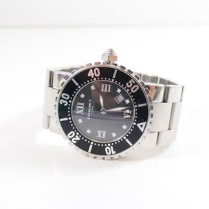 400 / 600 €CHAUMET, "Class One" : Montre-bracelet en acier, boîtier rond (diamètre : 35 mm), lunette tournante émaillée noire et graduée, cadran guilloché à fond noir, à chiffres romains et index, guichet dateur à 4H, mouvement mécanique à remontage automatique, sur bracelet articulé en acier à boucle déployante papillon en acier signée (Tour de poignet : 15,2cm environ).