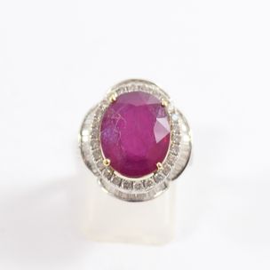 300 / 350 €Bague Pompadour : en or gris 750 mil. centrée d'une pierre rouge d'imitation dans un double entourage de diamants taille brillant et baguette. (TDD: 50). Poids brut : 5,4g