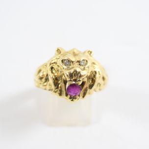 550 / 600 €Bague tête de lion : en or jaune 750 mil., les yeux sertis de petits diamants taille brillant et la gueule retenant un rubis. (TDD : 58). Poids brut : 9,6g