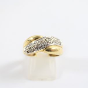 250 / 300 €Bague croisée : deux ors 750 mil. orné d'un pavage de petits diamants taille brillant. (TDD : 54). Poids brut : 4,3g. (Manque une pierre).