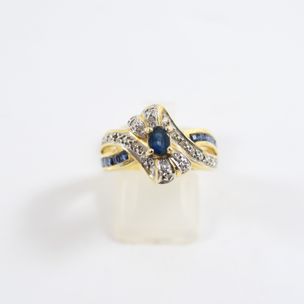 250 / 300 €Bague mouvementée : en or jaune 750 mil. centré d'un saphir taille ovale épaulée d'une ligne de saphirs calibrés et d'une ligne de petits diamants (0,02 carats chacun environ). (TDD : 52). Poids brut : 4,7g. (Manque une pierre).