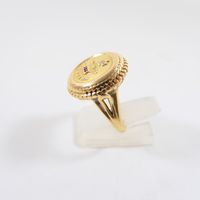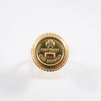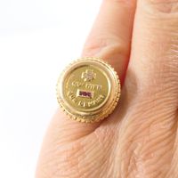 A. AUGIS, Bague d'amour "Plus qu'hier, moins que demain" : en or jaune 750 mil. à décor rayonnant, sertie de 3 pierres imitation rouges calibrées et d'un diamant taille 8/8, signée (TDD : 49). Poids brut : 6,7g