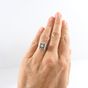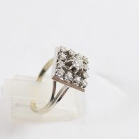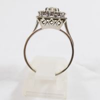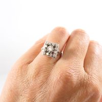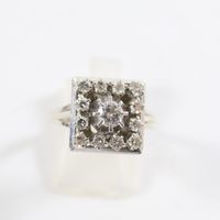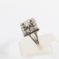 Bague : en or gris 750 mil. à chaton carré pavé de diamants à taille brillant (diamant central : 0,17 carats environ) (TDD : 54). Poids brut : 3,9g (Traces de mise à taille).