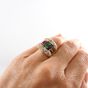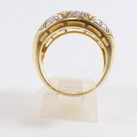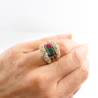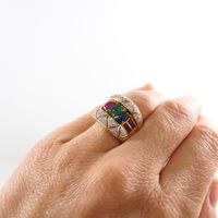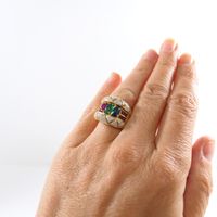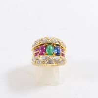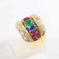 Bague bandeau à frise diamantée : en or jaune 750 mil. centré de trois cabochons de saphir, d'émeraude et d'un rubis épaulés de petits rubis calibrés. (TDD : 55) Poids brut : 14,2g