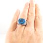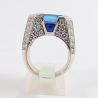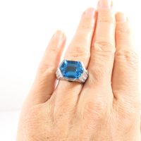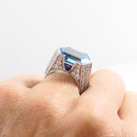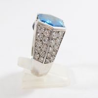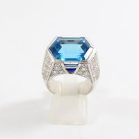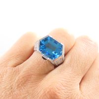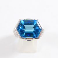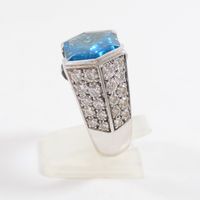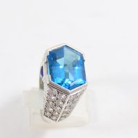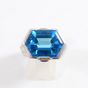 Bague dôme : en or rhodié 750 mil. centrée d'une topaze bleue (traité) taille hexagonale, épaulée d'un pavage de diamants taille brillant (0,05 carats environ chacun) et ponctuée de deux petites pierres bleue pain de sucre. (TDD : 54). Poids brut : 16,5g