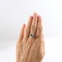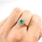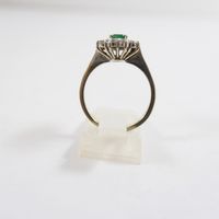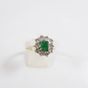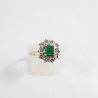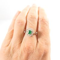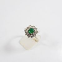 Bague fleur : en or gris 750 mil., centré d'une émeraude carrée à pans coupé, entourage de diamant taille brillant (0,05 carats environ). (TDD : 56,5). Poids brut : 4,1g