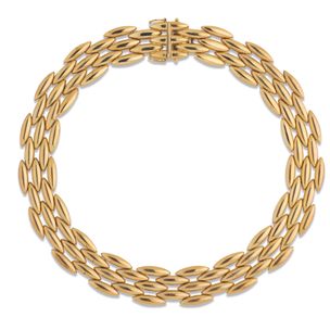 Broche barrette à décor de rinceaux ajourés : en or jaune 750 mil. centrée d'une perle de culture mabé dans un entourage de pierres bleues calibrées. (Longueur : 6,3cm). Poids brut : 4g