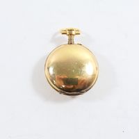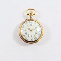 Montre de col : en or jaune 750 mil à cadran émaillé à fond blanc, les heures en chiffres romains noir, (diamètre : 25mm), cache poussière en or jaune 750 mil. Gravé Ferd. Ducot Bordeaux. Mouvement manuel à remontage mécanique. Poids brut : 17,5g