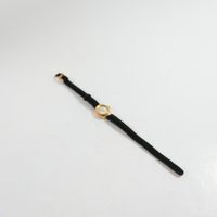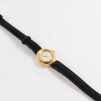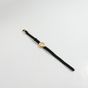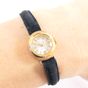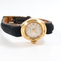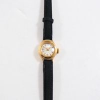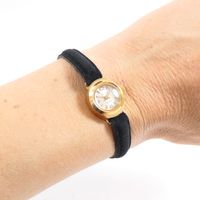 RELLIAC : Montre - bracelet de dame en or jaune 750 mil., petit boîtier rond (diam: 18 mm environ), cadran à fond crème rayonnant, les heures en chiffres arabes et index bâton appliqué doré. Mouvement mécanique à remontage manuel. Bracelet en cuir daim noir à boucle ardillon en métal. Poids brut : 9,8g